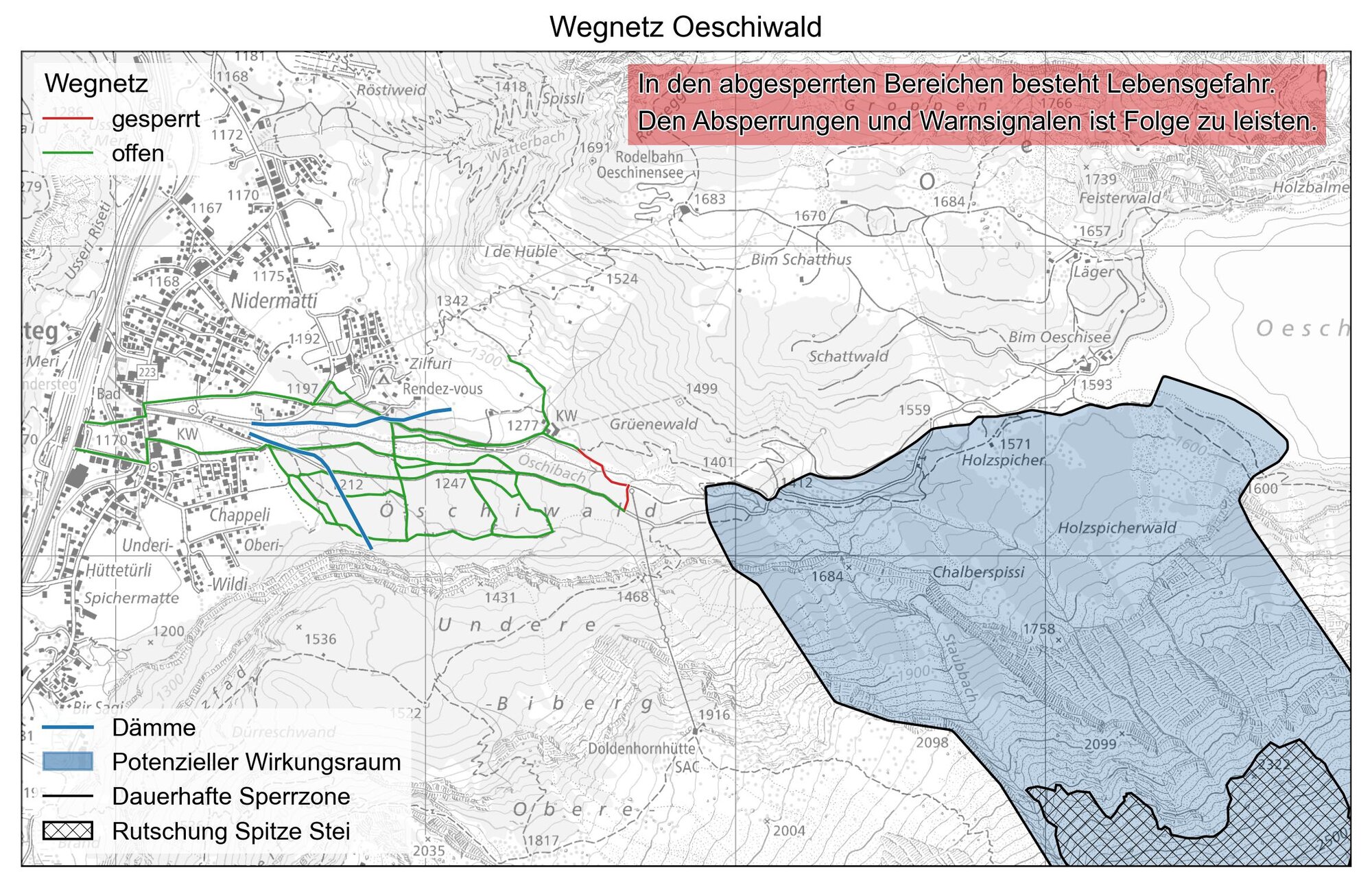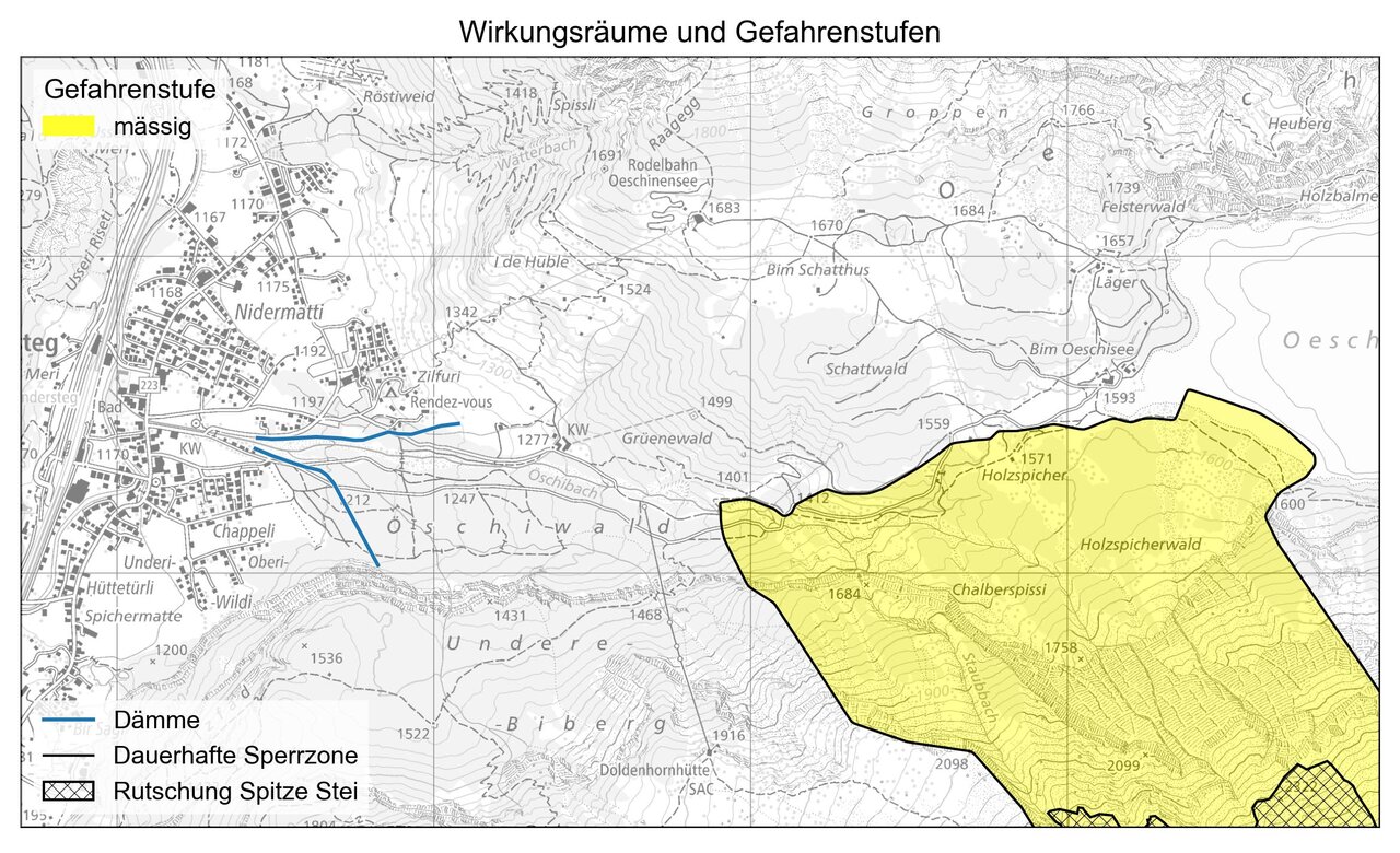 Bewohntes Gebiet ist nach aktuellem Kenntnisstand weder durch Sturz- noch Murgangereignisse gefährdet. Dies gilt auch für sämtliche offenen Bereiche im Gebiet Oeschinen.